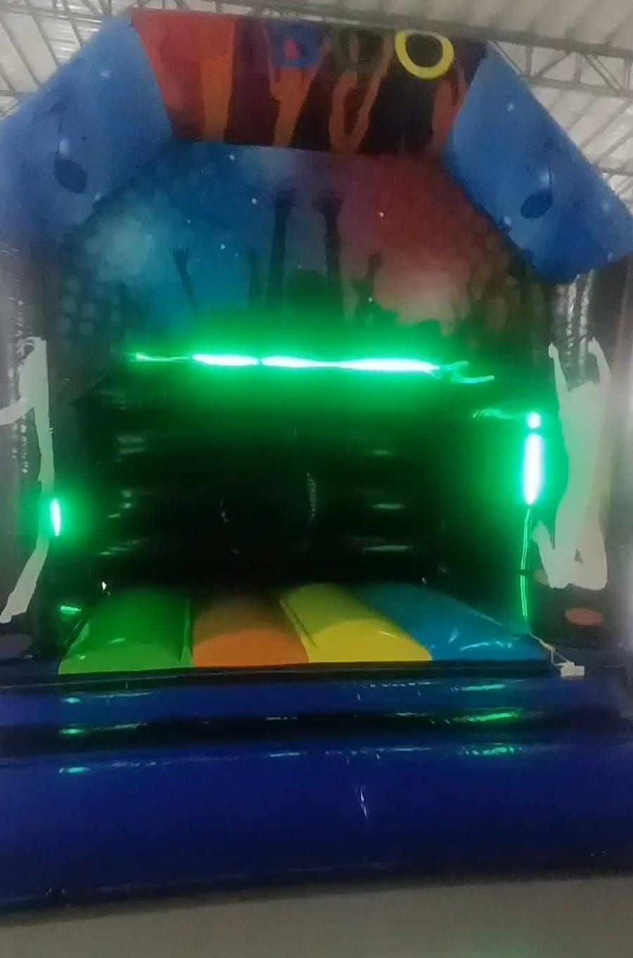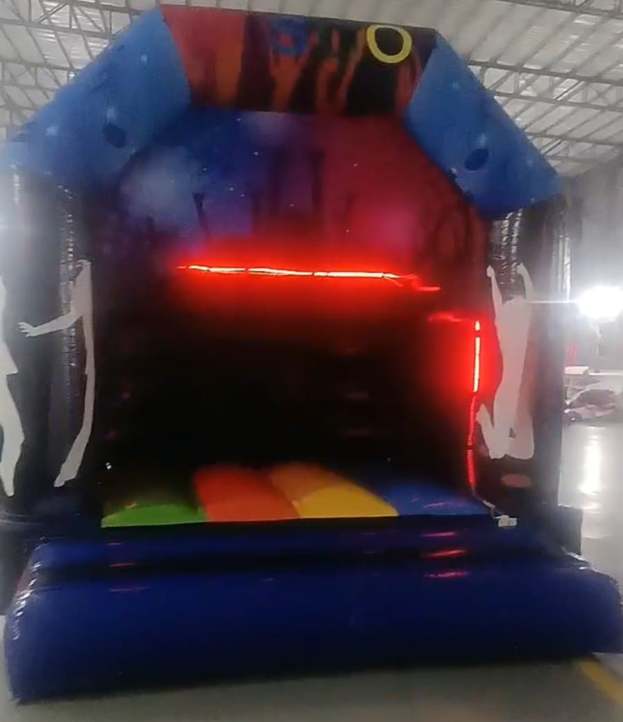 A 12x12 disco bouncy castle with lights and Bluetooth speaker, designed for children's entertainment. The bouncy castle measures 12 feet by 12 feet and this castle is equipped with disco lights that create a colorful and vibrant atmosphere inside the castle, enhancing the overall experience for children. Additionally, the castle is fitted with a Bluetooth speaker that allows kids to play their favorite music while bouncing around. This type of bouncy castle is a popular choice for birthday parties, family gatherings, and other events where kids need to be entertained.