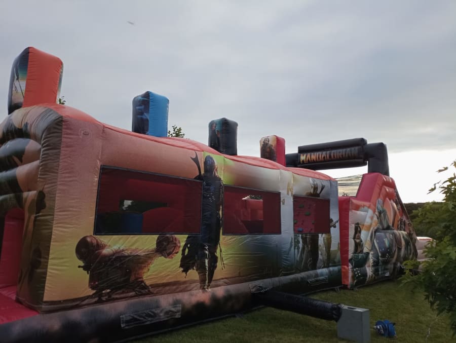 "Get ready to blast off into a galaxy far, far away with our Mandalorian themed obstacle course! This incredible inflatable is perfect for any Star Wars fan looking to take their party to the next level. With a design that's straight out of the show, your guests will feel like they're on a mission with the legendary bounty hunter himself.